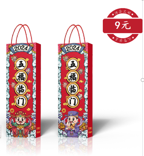 礼盒尺寸:385*100*50mm 装箱规格: 100盒/箱 产品内置:五福临门礼盒*1个 对联*1副1.2米 五福红包*5个 窗花*1对 福禄门神*1对 福字*1对